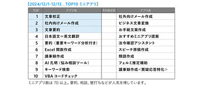 人気のあるミニアプリは、ビジネス系(要約、メール作成、Excel 関数作成、ビジネス文書変換、スピーチ原稿作成)、相談系(AI 孔明)、アイデア出しを支援する壁打ち系などがラインナップに入ります。「AI 孔明は悩み事にアドバイス(回答)してくれるミリアプリです。最初は業務に沿ったミニアプリが流行ると思っていましたが、気軽に相談できる相手として活用されており、これも実際に様々なミニアプリを作成する中でわかったことです。」(山田氏)
