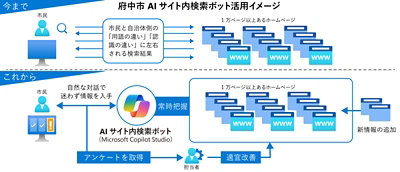 庁内システム基盤としてMicrosoft 365 を採用した府中市では、2024 年から Microsoft 365 Copilot および Copilot Studio を導入して、生成 AI 活用による行政業務の効率化にも着手。さらに「活用の幅を広げても追加費用が発生しない」ことを一助として、Copilot の活用を直接的な市民サービスへと拡大することを決定。Copilot Studio を活用して生成 AI チャットボット「AIサイト内検索ボット」を内製しています。