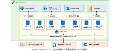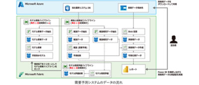 需要予測システムの基盤として採用されたのが Microsoft Fabric です。データの取り込み・変換・蓄積・可視化をひとつのプラットフォームで実現し、機械学習モデルの更新、推論・予測・データ加工などのパイプラインを構築。予測モデルの作成・検証には Azure Machine Learning を組み合わせ、専門家不在の環境でもわずか 2 か月で 400 ~ 500 モデルを検証。Power BI による可視化までを Fabric 内で完結させ、データ活用基盤の内製化を実現しています。