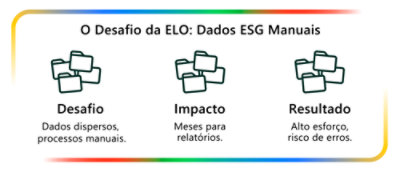 A Elo precisava superar relatórios de sustentabilidade manuais e fragmentados, com planilhas dispersas que atrasavam processos e dificultavam decisões.